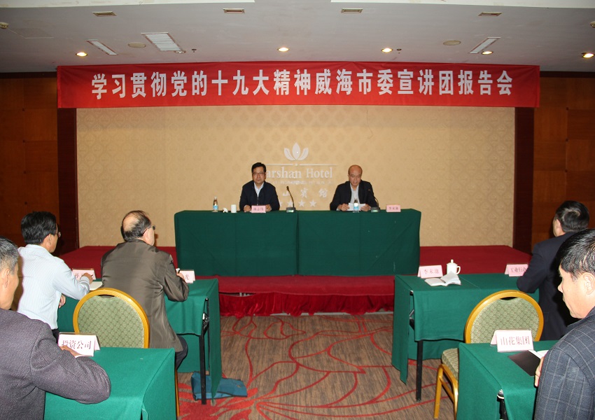 11月15日下午,根据市委统一安排部署,学习贯彻党的十九大精神威海市委宣讲团首场报告会在塔山宾馆举行。威海市委宣讲团成员、市委工业工委书记、市经信委主任杨志伟作宣讲报告,市委工业工委委员、市经信委副主任李末池主持报告会。市委工业工委委员、市经信委全体机关工作人员、委属各单位全体工作人员、工业工委基层党委书记及党建负责人近110人参加报告会。