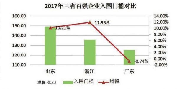 2017年山东、浙江、广东三省百强企业的入围门槛分别是149.14亿元、135.82亿元、125.38亿元,较上年度分别增长10.21%、11.93%、-0.74%。三省中山东百强企业入围门槛最高。