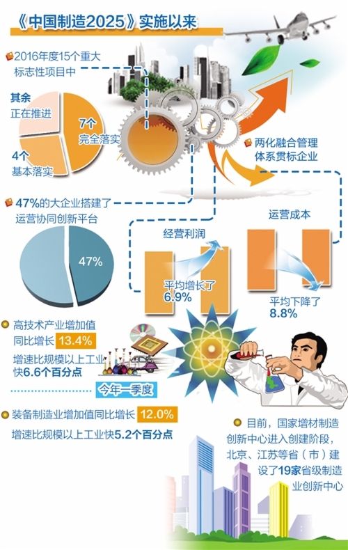 自《中国制造2025》实施以来,国家制造业创新中心建设、智能制造、工业强基、绿色制造、高端装备创新等“五大工程”扎实推进。在2016年度15个重大标志性项目中,已有7个完全落实,4个基本落实。整体看,我国制造业有自己的独特机遇和优势,“中国制造2025”可期可待—— 2015年5月份,国务院发布《中国制造2025》,这是我国实施制造强国战略第一个十年的行动纲领。两年过去,距离2025年只有8年时间了,国内社会各界越来越关注《中国制造2025》的实施情况,国际上近来也出现了多种声音。那么,目前各项工作进展情况到底如何?我国究竟能否如期实现目标?记者采访了相关专家。 成效初步显现 工信部数据显示,自《中国制造2025》实施以来,国家制造业创新中心建设、智能制造、工业强基、绿色制造、高端装备创新等“五大工程”扎实推进;在2016年度15个重大标志性项目中,7个完全落实,4个基本落实,其余正在推进。47%的大企业搭建了运营协同创新平台,两化融合(信息化和工业化融合)管理体系贯标企业运营成本平均下降了8.8%,经营利润平均增长了6.9%。 工业和信息化部运行监测协调局副局长黄利斌在近日召开的国新办新闻发布会上表示,两年来,《中国制造2025》政策措施“为稳定工业增长、加快制造业转型升级发挥了重要作用”,效果初步显现。 在国务院发展研究中心产业经济研究所研究员许召元看来,《中国制造2025》提出的一系列任务中,有三个最大的亮点。 “首先是推动国家制造业创新中心建设,这是构建国家制造业创新体系的重要举措。”许召元表示,继国家动力电池创新中心成立后,目前国家增材制造创新中心进入创建阶段,北京、江苏等省(市)建设了19家省级制造业创新中心。形成开放性的平台,能够为更多企业提供服务,也有利于解决我国长期以来产学研联动的问题。还有就是推进制造业与互联网融合发展和优化制造业发展环境。工业互联网领域必须要抢先发展才有话语权,营造良好的营商环境,对其他行业都有很好的引导作用。 赛迪智库规划研究所所长乔标表示,《中国制造2025》的发布实施,引起了社会各界的广泛关注,得到了各地政府的高度重视。在这些成绩中有两点最为突出。一方面,全社会重视实体经济,重视制造业的良好局面正在形成。国家层面先后出台了11个重点领域的实施方案或行动计划,绝大多数省(区、市)成立了制造强省(区、市)建设领导小组,制定了实施方案或行动纲要,启动了一批重大工程和专项。这些措施有力地促进了制造业投资,对制造业企稳向好起到了积极作用。今年一季度,高技术产业和装备制造业增加值同比分别增长13.4%和12.0%,增速分别比规模以上工业快6.6和5.2个百分点。 另一方面,一批重大创新成果不断涌现,“中国制造”的国际竞争力明显增强。比如,高精度数控齿轮磨床、多轴精密重型机床、数控冲压生产线等产品跻身于世界先进行列;ARJ21-700新型涡扇支线客机投入商业运营,C919大型客机实现首飞,全球首颗量子卫星发射成功;自主研制的“海斗”号无人潜水器使我国成为继日本、美国之后第三个拥有研制万米级无人潜水器能力的国家,等等。 主攻智能制造 两年来,“中国制造2025”实施取得了初步成效,但与发达国家相比,我国制造业大而不强的特征还很明显,尤其是在工业基础、自主创新、绿色发展等方面还有较大差距。 许召元表示,我国制造业的首要短板是普遍盈利能力偏低,影响了创新升级的能力。企业的创新能力,并不是只需要一个成熟的智能化制造方案,还需要将企业的创新能力嵌入到智能制造当中去。 “以工业基础为例,基础不牢依然是制造强国建设的重要短板。”乔标介绍说,一方面,核心零部件、基础原材料、控制系统等主要依赖进口,“中国制造”遭遇“锁喉痛”。大量使用国外核心零部件和控制系统,不仅价格高,设施安全稳定运行的控制权也基本掌握在他人手中。另一方面,基础产品可靠性、稳定性和使用寿命不高,“中国制造”出现“软骨病”。 乔标说,总体来看,这些短板领域,往往也是市场失灵的领域,需要发挥好政府的引导和扶持作用,多措并举、综合施策。发挥中央政府的统筹作用,强化顶层设计和制度安排,发挥地方政府的枢纽作用,抓好强基项目落地和企业培育。同时,还要发挥骨干企业的引领作用、行业协会的桥梁作用和科研机构的支撑作用。 此外,从国际上来看,近年来为推动制造业发展,不少国家推出了新的计划。“工业4.0”是德国推出的概念,美国推出“工业互联网”,我国推出“中国制造2025”,这三者本质内容是一致的,都指向一个核心,就是智能制造。 许召元表示,智能制造是《中国制造2025》最核心最重要的发展方向,也是我国转型升级最重要的部分。我国制造业总体处于中低端,但是也有一些企业具有相当的竞争实力,目前很多行业都已经出现了一些比较好的智能制造案例。如三一重工的“18号厂房”的“柔性生产线”,不仅可以同时生产多种产品,还可以保证最快一小时下线一台泵车。 “智能制造是全球制造业发展的大趋势,也是制造强国建设的主攻方向。”乔标表示,近两年来,我国不断完善顶层设计、标准体系建设和开展试点示范,成效较为明显。智能家电、智能移动终端、智能机器人等产业快速发展,协同研发制造在航空、汽车等行业开始兴起,大规模个